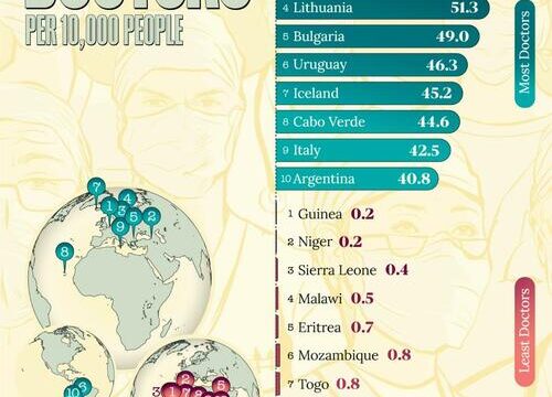 This graphic, via Visual Capitalist’s Pallavi Rao, maps and ranks the countries with the highest and lowest doctor density (measured per 10,000 population), according to World Health Organization (WHO) estimates as of 2022.
