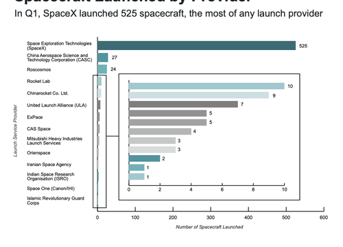 Using data from BryceTech, SpaceX launched 525 spacecraft into orbit in the first quarter, far outpacing China and Russia.