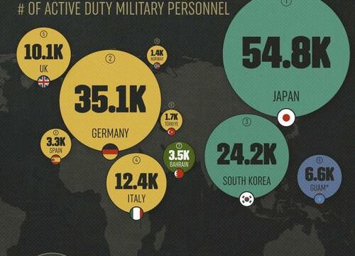 South Korea also has a significant garrison, nearly 25,000 active duty personnel. This is also a legacy from the Korean War.