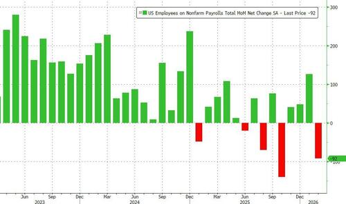 In our nonfarm payrolls preview, we quoted JPMorgan’s Market Intel desk which said that “for this print, the stronger the better”, which by implication means that a poor number would be bad. By that logic, the actual number couldn’t be any worse, because moments ago the BLS reported that in February, the US lost 92,000 jobs, a huge drop from the downward revised (of course) 126K in January, and the second worst print since 2020 (only October’s shock -140K was worse), and this time, the massive drop can’t be dismissed as a one-time drop in government payrolls. The number of private payrolls dropped by 86K, also a huge miss to estimates of a 60K increase.