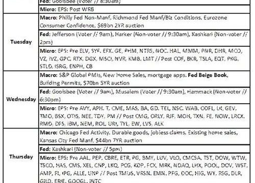 Finally, looking at just the US, Goldman writes that the key economic data releases this week are the durable goods report on Thursday and the University of Michigan report on Friday. There are several speaking engagements by Fed officials this week.