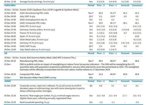 Focusing just on the US, Goldman writes that the key economic data releases this week are the ISM manufacturing index on Monday, the ISM services index on Wednesday, and the employment report on Friday. There are several speaking engagements from Fed officials this week, including a speech on the economic outlook by Governor Waller on Monday.
