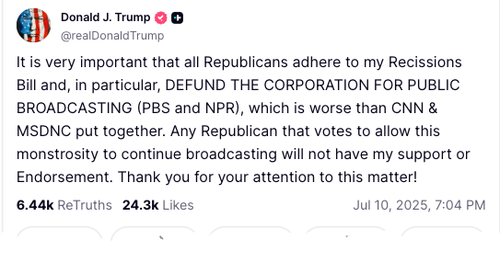 “It is very important that all Republicans adhere to my Recissions Bill and, in particular, DEFUND THE CORPORATION FOR PUBLIC BROADCASTING (PBS and NPR), which is worse than CNN & MSDNC put together,” Trump wrote on his social media platform Truth Social, using a hilarious nickname for MSNBC.