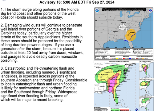 The weather agency noted, “In particular the inland wind hazards of Helene are highlighted by the new experimental cone. A widespread area of Tropical Storm Warnings are still in effect for North Florida, most of Georgia, all of South Carolina, and Western North Carolina.”
