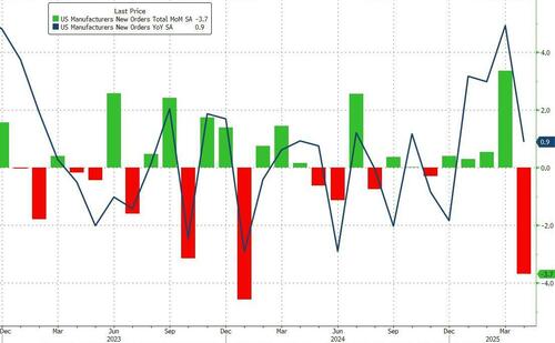 After surging in March – tariff-frontrunning dominated with the largest MoM rise since July 2020 – US Factory Orders tumbled 3.7% in April (worse than the 3.2% MoM decline expected). Also, the 4.3% rise in March was revised down to a 3.4% MoM rise…
