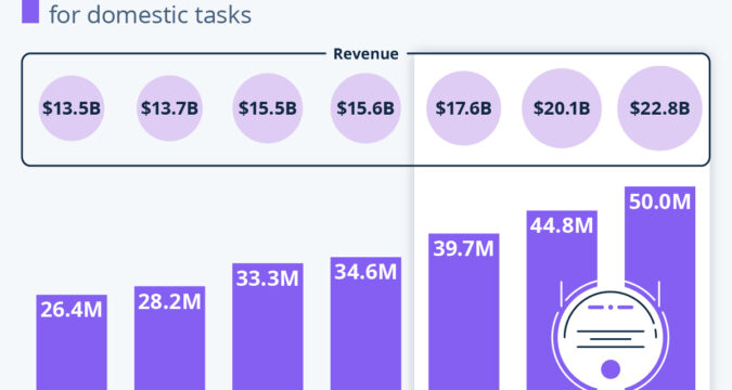 According to data from Statista Market Insights, reported by Anna Fleck, global revenue of service robots for domestic tasks is set to nearly double from $13.5 billion in 2021 to $22.8 billion in 2027.
