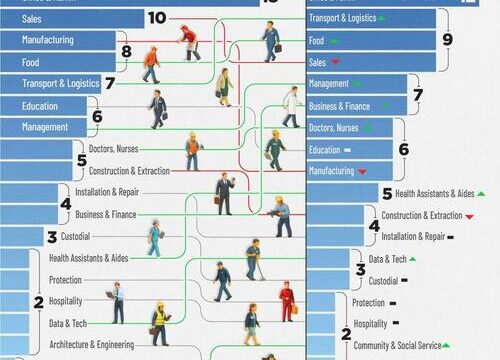 The visualization, via Visual Capitalist’s Pallavi Rao, compares how 100 hypothetical workers were distributed across occupations in 2002 versus 2024. It revealing which fields lost—or gained—share during a period marked by globalization, new technology, and a pandemic.