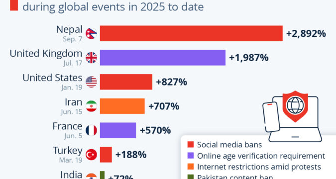 As Statista’s Katharina Buchholz shows in the chart below, using data from website Top10VPN, Nepal’s social media blocks elicited the most pronounced response in terms of people looking for a way around via VPNs this year.
