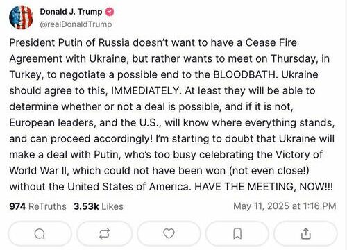 “I’m starting to doubt that Ukraine will make a deal with Putin, who’s too busy celebrating the Victory of World War ll, which could not have been won (not even close!) without the United States of America,” Trump wrote Sunday. “HAVE THE MEETING, NOW!!!” This has apparently nudged both sides, but it remains anything but clear whether Putin is himself ready to fly to Istanbul, especially given there are no clear, practical signs Kiev is ready to offer any significant compromise, or anything new will come of it.