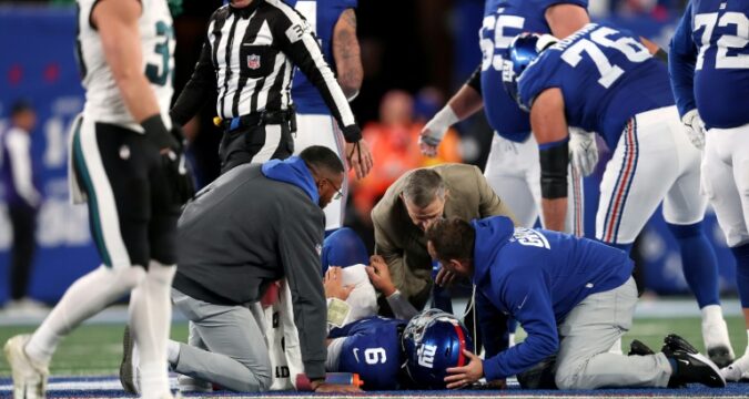 New York Giants quartrback Jaxson Dart, on the field, is treated by team medical staffers after being sacked and grabbing his head in an NFL victory over Philadelphia, with the league investigation how he was evaluated for a concussion (ELSA)